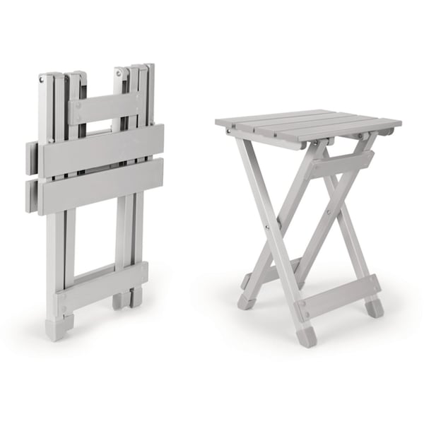 This table combines lightweight materials with a durable design. Perfect for RVing, camping, tailgating or out on the porch or patio. Table sets up without tools in seconds and folds to only 2" wide for compact storage. Small table has a 12" x 10" top, opens to 16.5" tall and supports up to 130 lb. Folded dimensions: 18.5" x 12" x 2".