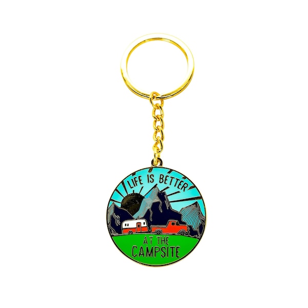 Camcos Life is Better at the Campsite Keychain is decorative and great for RV enthusiasts. The keychain measures 1.57-inches in diameter and is the perfect accessory for your keys. Its design features a RV camping theme with sunrise. Made out of durable zinc die cast and coated in enamel