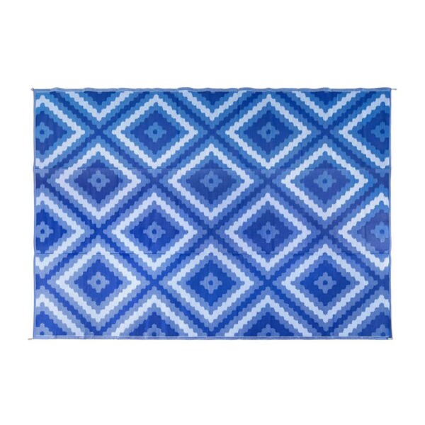 The Camco Zig Zag Diamond Blue Outdoor Mat is perfect for putting by your RV, campsite or patio. It features a double-sided reversible pattern made from resilient material that is mold and mildew-resistant. Simple to clean and lightweight to carry, the outdoor mat requires little maintenance and folds easily for storage