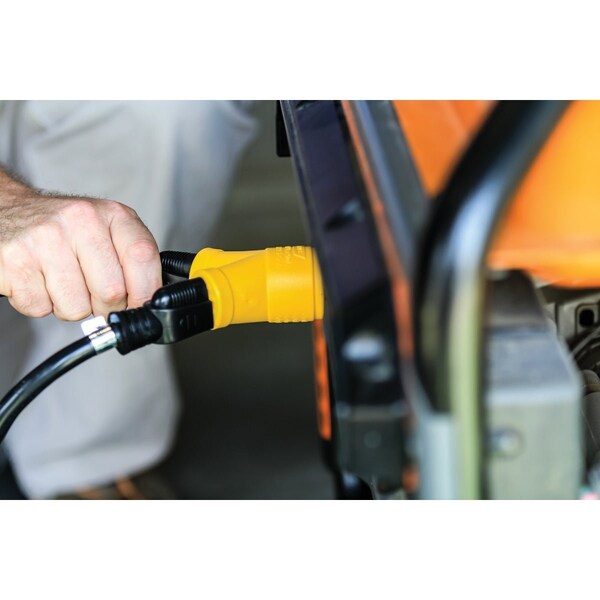 Power Grip Y generator adapter allows you to easily and safely split one 30 Amp receptacle into two 15 Amp receptacles.