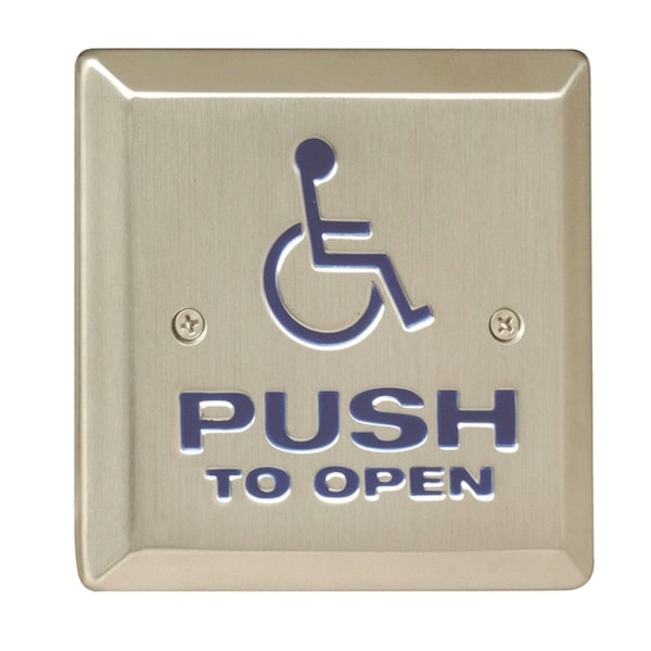4-1/2-in Square Push Plate Switch, Exposed Screws, SPDT Relay, 'Push to Open' Text/Wheelchair Symbol, Satin Stainless Steel Finish