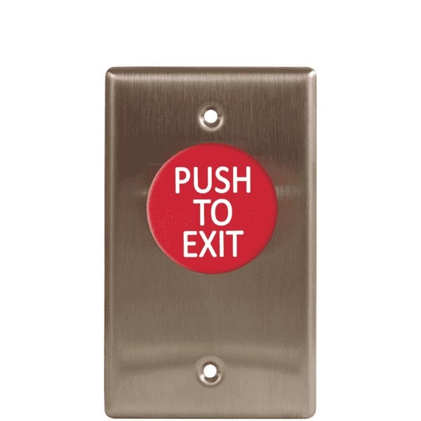 Camden: Mushroom push button Single gang, N/O and N/C contacts, Red button, 'Push to Exit' engraved on button.