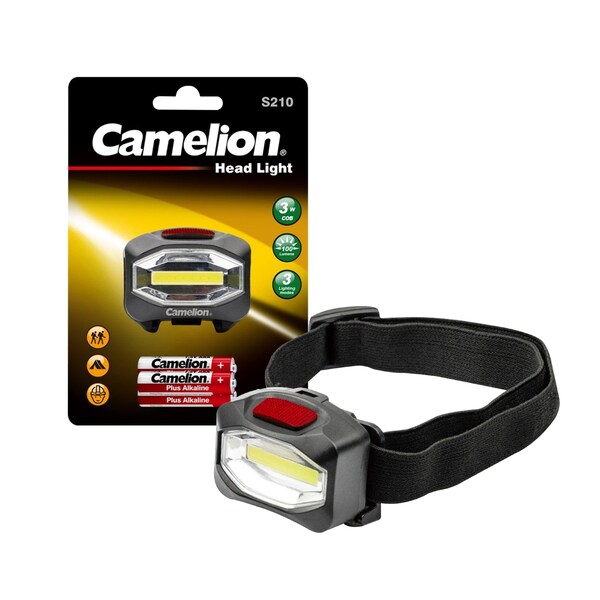 The Camelion S210 head lamp has an integrated 3W COB which provides outstanding illumination and a long beam distance.It has three lighting modes and can be adjusted 45°. The nylon head band allows you hands-free operation and fits adults and kids comfortably and securely.This head light is the ideal light for outdoor activities and jobs that require the use of both hands.Power Source: 3 x AAA BatteriesLight Source: 3W COB LEDLighting Mode: High / Low / FlashingLuminous Flux: High 100lm / Low 40lmOperating Time: High 7 Hours, Low 15 HoursProduct Dimensions: 2.40 x 1.77 x 1.38 inchesPackaging Dimensions: 4.94 x 6.82 x 2.81 W x H x D