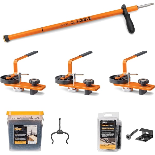 Everything you need to install 500 sq ft of grooved decking all in one box. CAMO Deck-in-a-Box comes with one set of 900ct Edge Universal Hidden Deck Clips, one set of CAMO Starter Clips for your starting boards, three CAMO Levers to lodge your boards in place during installation, and one CAMO Clipdrive to fasten your Edge Clips while standing. With the CAMO system build your deck up to 5x faster. Edge Universal Hidden Deck Clips are approved for use with all leading composite, PVC, capped composite, and hardwood grooved boards. They offer superior strength and holding power thanks to their Stainless Steel screw and gusset. The 2-1/4 in. x #7 screw buries down deeply into the joist while the gusset fits into the groove of the board, securing it down when the screw is fastened. Use the provided CAMO Starter Clips to install the starting deck boards. CAMO Lever with one turn, can straighten warped boards and lock rows of boards and clips in place, while keeping spacing consistent. Once you get your boards in place, simply set LEVER on the single, double, or metal joists, lock-in your boards, and you're free to fasten. CAMO Clipdrive was designed to speed up your grooved composite decking jobs and save your body.This ergonomic deck tool allows you to stand comfortably while fastening universal grooved composite deck clips.