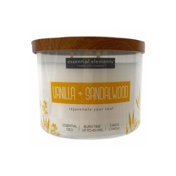 Essential Elements, 1475 OZ, Vanilla Sandalwood, 3Wick Jar Candle With Gray Wood Lid, Made Of Natural Ivory Wax Essential Oils