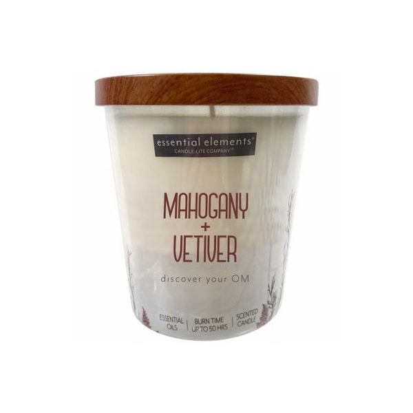 Essential Elements, 9 OZ, Mahogany Vetiver, Jar Candle With Gray Wood Lid, Made Of Natural Ivory Wax Essential Oils