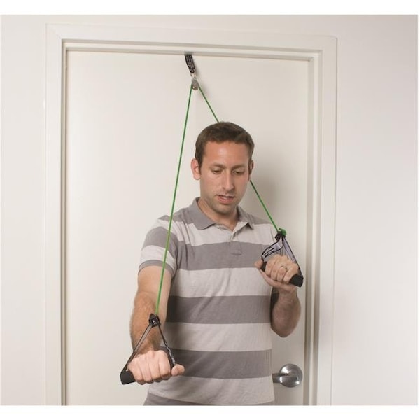 The CanDo shoulder pulley with tubing and handle helps increase the range-of-motion (ROM) of shoulder. It can be used for prevention and rehabilitation of shoulder injuries. Mount the set to the doorway. The set includes tubing, handles, swivel-pulley, and a door anchor for easy mounting on top of door or in door jamb.