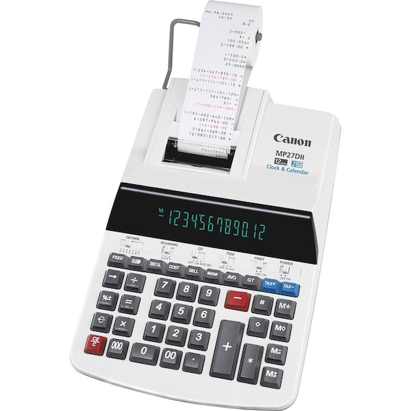 12-digit heavy-duty printing calculator features an extra-large, fluorescent tube display and a high-speed, two-color ribbon printing. Print 4.8 lines per second with positive numbers in black and negative numbers in red. Plain paper roll is 2-1/4" (57mm) wide. Quick reference guide briefs you on main functions or address book information. Functions include time calculation, average, one-touch tax calculation, clock/calendar, cost/sell/margin calculation, sign change, item count, memory, grand total, round-up/off/down, shift key, and 0, 00, 000 keys. Decimal point positions include add mode, 0, 2, 3, 4, 6, and floating. Calculator runs on AC power and shuts off automatically after seven minutes.