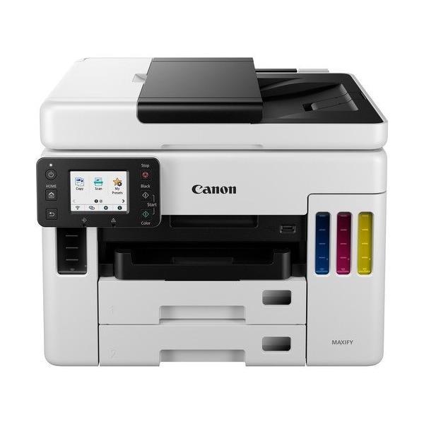 Use MAXIFY GX7021 Wireless MegaTank Small Office All-In-One Printer to meet the needs of small offices by delivering high-quality, cost-effective printing and outstanding wireless connectivity. Get serious print productivity with a high page yield of up to 6,000 black/white pages and 14,000 color pages per full ink bottle set and a combined, 600-sheet input capacity. Printer is easy to set up and maintain and delivers superior versatility thanks to a 50-sheet, duplex auto document feeder for scanning two-sided, copying and faxing. Print on a variety of media types and sizes, including labels, envelopes and banners. Produce crisp, colorful documents quickly and cost-effectively thanks to fast print speeds and a four-color, pigment-based ink system. Easily connect and print through high-speed USB, Ethernet or wirelessly from computers or mobile devices. Printer also includes fast print speeds of up to 24 ipm black and 15.5 ipm color, a 2.7in LCD touch screen and a small footprint.