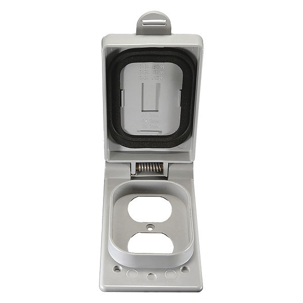 Weatherproof Cover, Mounting Box PVC Boxes, For Use With Duplex Receptacles, Mounting Orientation Vertical, Lid Style Self Closing, Number of Gangs 1, Gasket Material Polymeric/Third Party, Cover Material PVC, Color Gray, Height 1 in, Width 3 in, Depth 5 1/2 in, Standards UL Listed, Includes Gaskets, Screws