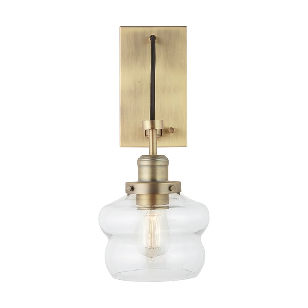 1 light adjustable swing arm sconce with Aged Brass finish, Clear glass and optional cord/plug.