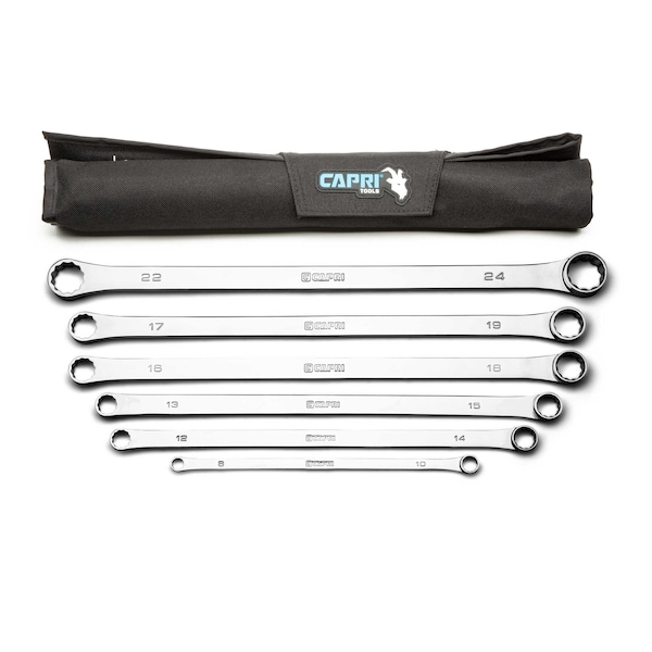 The Capri Tools 0 Degree Offset Extra Long Box End Wrenches are designed to let you easily tackle recessed bolts and bolts in tight spots. The thin-walled super thin box end with deep profile grabs firmly onto recessed bolts. 0 degree offset allows for a secure fit onto fasteners, giving your higher torque and easier swing. Extra long handles, up to 2x longer than standard wrenches, give you more leverage. The wrenches are constructed with premium Chrome Molybdenum steel to provide exceptional strength and durability. These box ends have 12-point WaveDrive which transfers torque uniformly and prevents damaging and rounding of the bolt. Our MaxChrome plating requires each wrench to be impeccably polished and finished with careful application of chrome protective plating. it ensures durability and corrosion resistance. Large stamped sizing won't fade over time. 6-piece set with 12 sizes: 8 x 10 mm, 12 x 14 mm, 13 x 15 mm, 16 x 18 mm, 17 x 19 mm, 22 x 24 mm.