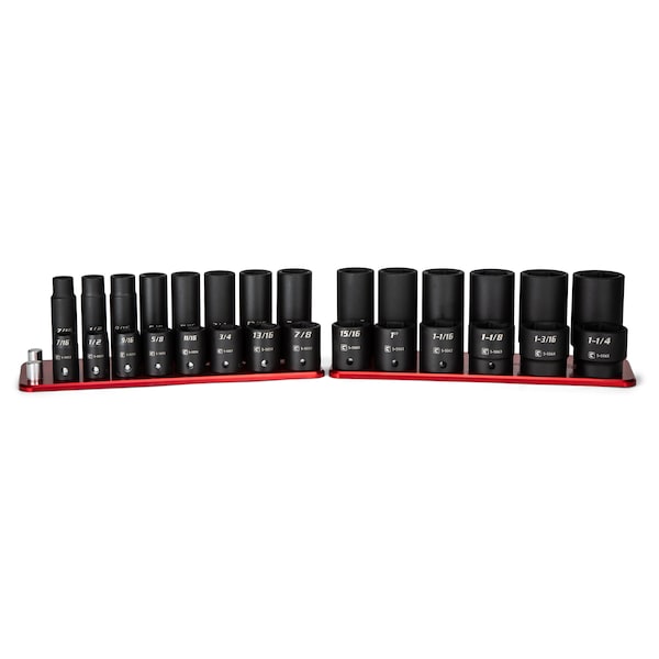 The Capri Tools 3/8 in. Drive Shallow and Deep Impact Socket Set is a collection of most frequently used 3/8 in. drive shallow and deep impact sockets in SAE sizes. We use premium Chrome Molybdenum steel tempered with our proprietary heat treatment process to make these impact sockets and accessories. They are durable and specifically made to withstand high torque from power tools. Each item is expertly coated with manganese phosphate, the preferred coating in military and aerospace, which offers superior protection and corrosion resistance compared to black oxide coating on other impact sockets. The 6-point WaveDrive design grips fasteners more tightly than traditional design, preventing fastener rounding and giving you more leverage. Meets and exceeds ASME B107.110 standards. 28-piece set includes (14) 1/2 in. drive deep impact sockets: 7/16, 1/2, 9/16, 5/8, 11/16, 3/4,13/16, 7/8, 15/16, 1, 1-1/16, 1-1/8, 1-3/16, and 1-1/4 in. and (14) shallow impact sockets: 7/16, 1/2, 9/16, 5/8, 11/16, 3/4,13/16, 7/8, 15/16, 1, 1-1/16, 1-1/8, 1-3/16, and 1-1/4 in. Comes with a billet aluminum socket rail made by Westling Machine in the USA.