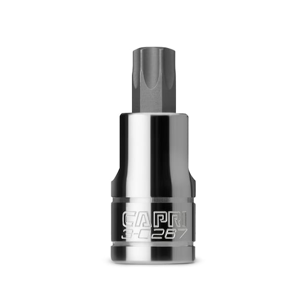 The Capri Tools bit sockets are made for the most demanding professionals. Each of our bit sockets is made from custom forged steel that underwent a proprietary heat treatment process and precisely machined to perform in toughest situations. Premium S2 steel forged bits are exceptionally strong and durable. They withstand high torque and do not twist, protecting both the bit and the fastener. All bits feature chamfered end to ensure a smooth fit onto fasteners. The sockets are constructed with premium Chrome Vanadium steel and plated with our own SmartKrome protective plating. They are durable and resist corrosion. Meets and exceeds ASME B107.110 standards. Single 1/2 in. drive, T55 star bit socket.