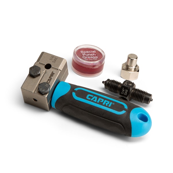 Get the job done in half the time: this compact and portable Double Flaring Tool lets you easily create high quality 45-degree SAE double flares on 1/4 in. tubing such as brake lines. Works flawlessly with 1/4 in. steel, nickel, and copper tubing. Compact design lets you create perfect double flares both off vehicle and on vehicle, even in tight spots. Detachable die lets you also use with a bench vise. All-in-one tool. All you need is a 10 mm and a 17 mm wrench to work with the tool. The Capri Tools Double Flaring Tool lets you create perfect 45-degree SAE double flares in half the time compared to old generation flaring tools. Its compact and portable design lets you work both off vehicle and on vehicle, even in tight spots. The die can be detached so you can also work with a bench vise for more grip. The tool works flawlessly with 1/4 in. steel, nickel, and copper tubing. This is an all-in-one tool. A 10 mm and a 17 mm wrenches are the only other tools you need to start making perfect double flares.
