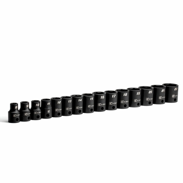 The Capri Tools 3/8 in. Drive Shallow Impact Socket Set is a collection of most frequently used 3/8 in. drive shallow impact sockets in metric sizes. We use premium Chrome Molybdenum steel tempered with our proprietary heat treatment process to make these impact sockets and accessories. They are durable and specifically made to withstand high torque from power tools. Each item is expertly coated with manganese phosphate, the preferred coating in military and aerospace, which offers superior protection and corrosion resistance compared to black oxide coating on other impact sockets. The 6-point WaveDrive design grips fasteners more tightly than traditional design, preventing fastener rounding and giving you more leverage. Meets and exceeds ASME B107.110 standards. 15-piece set includes 3/8 in. drive shallow impact socket: 8, 9, 10, 11, 12, 13, 14, 15, 16, 17, 18, 19, 20, 21, 22 mm.