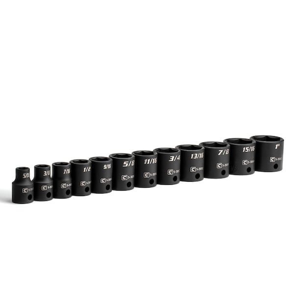 The Capri Tools 3/8 in. Drive Shallow Impact Socket Set is a collection of most frequently used 3/8 in. drive shallow impact sockets in SAE sizes. We use premium Chrome Molybdenum steel tempered with our proprietary heat treatment process to make these impact sockets and accessories. They are durable and specifically made to withstand high torque from power tools. Each item is expertly coated with manganese phosphate, the preferred coating in military and aerospace, which offers superior protection and corrosion resistance compared to black oxide coating on other impact sockets. The 6-point WaveDrive design grips fasteners more tightly than traditional design, preventing fastener rounding and giving you more leverage. Meets and exceeds ASME B107.110 standards. 12-piece set includes 3/8 in. drive shallow impact socket: 5/16, 3/8, 7/16, 1/2, 9/16, 5/8, 11/16, 3/4, 13/16, 7/8, 15/16, 1 in.