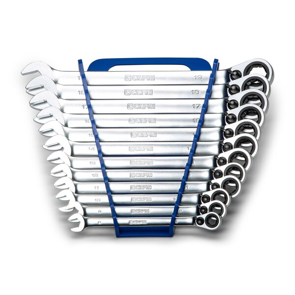 Experience complete confidence tackling tough fasteners with our 72-tooth 6-point reversible ratcheting combination wrenches. Reversible single-pawl 72-tooth ratcheting gear provides just 5 degrees of swing arc; switch between directions with a simple thumb switch. The 6-point box end with our WaveDrive Plus design provide a sure grip onto fasteners and high turning torque while preventing rounding and damaging the bolt. WaveDrive Plus grips fasteners even when they are up to 90% rounded. 15-degree offset box end gives you knuckle clearance and ease in working in tight spots. The open end is tipped at a 15-degree angle; useful especially in tight spots, after each 15-degree turn, flip the wrench over to quickly engage the fastener again. We made these wrenches long pattern, 20% longer than standard length, to give you more leverage. The wrenches are coated with our premium SatinKrome finish, our most sophisticated finishing and protective coating process, enhances durability and gives and wrench an unparalleled look and feel. Comes with a convenient wrench rack for easy storage and transport. 12-piece set includes: 8, 9, 10, 11, 12, 13, 14, 15, 16, 17, 18, and 19 mm