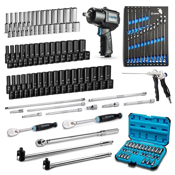 The Capri Tools Apprentice Mechanics Tool Set is a mater tool set meticulously curated from our catalog to provide essential tools for apprentice mechanics. These premium tools are perfect for both novice and seasoned mechanics. Precision-crafted from premium materials, they are made to perform and made to last. 161-piece metric set includes 14 1/4 in. drive 6-point shallow chrome sockets, 14 1/4 in. drive 6-point deep chrome sockets, 15 3/8 in. drive 6-point shallow impact sockets, 15 3/8 in. drive 6-point deep impacts sockets, 18 1/2 in. drive shallow impact sockets, 18 1/2 in. drive deep impact sockets, 32 1/4, 3/8, 1/2 in. drive hex bit sockets, 1 1/2 in. drive Twin Power Impact Wrench, 9 1/4, 3/8 in. drive Wobble Plus extension bars, 19 combination wrenches, 1 Windstrom air blow gun, 2 3/8, 1/2 in. drive extended leverage breaker bars, 2 1/4, 3/8 in. drive 90-tooth soft grip ratchets, and 1 1/2 in. drive industrial torque wrench.