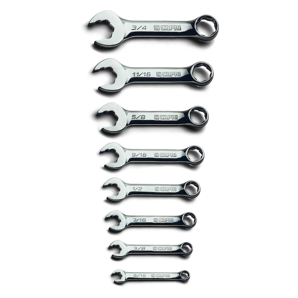 Your new go-to wrench for tackling bolts in virtually any condition, the WaveDrive Pro Combination Wrench features a specialized geometry that gives you a powerful grip on bolts, and even works as a bolt extractor on bolts that are up to 90% rounded off. WaveDrive Pro, on both open end (3-point) and box end (6-point), gives you a sure grip and satisfying turns on both unrounded and rounded bolts. WaveDrive Pro also prevents damaging and rounding of bolts. Stubby length handle lets you access hard-to-reach areas where clearance is limited. 15-degree offset box end for knuckle clearance and working in tight spots. Premium Chrome Vanadium steel construction with MaxChrome plating, impeccably polished and finished with careful application of chrome protective plating, ensures durability and corrosion resistance. Set completes with a heavy-duty water-resistant canvas pouch. 8-piece set: 5/16 x 5/16 in., 3/8 x 3/8 in., 7/16 x 7/16 in., 1/2 x 1/2 in., 9/16 x 9/16 in., 5/8 x 5/8 in., 11/16 x 11/16 in., 3/4 x 3/4 in. The Capri Tools WaveDrive Pro Combination Wrenches are a new generation of combination wrenches that lets you tackle bolts in virtually any condition. They feature WaveDrive Pro with a specialized geometry that gives you a powerful grip on bolts, even works as a bolt extractor on bolts that are up to 90% rounded off. WaveDrive Pro open end (3-point) and box end (6-point) give you a sure grip and satisfying turns on both unrounded and rounded bolts. WaveDrive Pro also prevents damaging and rounding of unrounded bolts. The stubby length handle lets you access hard-to-reach areas where clearance is limited. The box end is offset 15-degrees for knuckle clearance and working in tight spots. Made with premium Chrome Vanadium steel and each wrench is impeccably polished and finished with careful application of our MaxChrome protective plating, ensuring durability and corrosion resistance.
