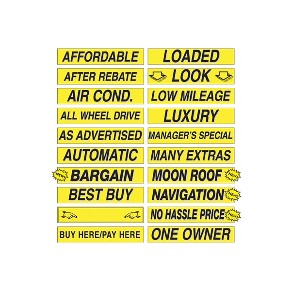 Bright Yellow & Black, 3-D shaded design, adhesive windshield sign. An inexpensive yet highly effective sales tool to advertise a feature or selling point! Sold by the dozen {12 per pack}. Size: 15" long x 2 3/4" tall. Neatly shrink wrapped in packs of a dozen with a chipboard backer to prevent curling during storage. Made of durable, waterproof vinyl, these bright, non-fade signs demand attention! Each sign is slit on the back for easy application. Removable adhesive allows easy, clean removal. Please note these adhesive signs are not reusable.