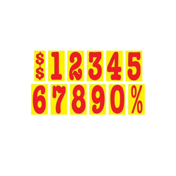 New designer look with non-fade inks! Bold Red on Super Bright Yellow background adhesive windshield number. An inexpensive yet highly effective sales tool to advertise a year model or price. Sold by the dozen {12 per pack}. Size: 5 1/2" tall x 2 " wide. Neatly shrink wrapped in packs of a dozen with a chipboard backer to prevent curling during storage. Made of durable, waterproof vinyl, these bright, non-fade numbers demand attention! Each number is slit on the back for easy application. Removable adhesive allows easy, clean removal. Please note these adhesive numbers are not reusable. Not sure what to get? Try our Starter Kit. See 228