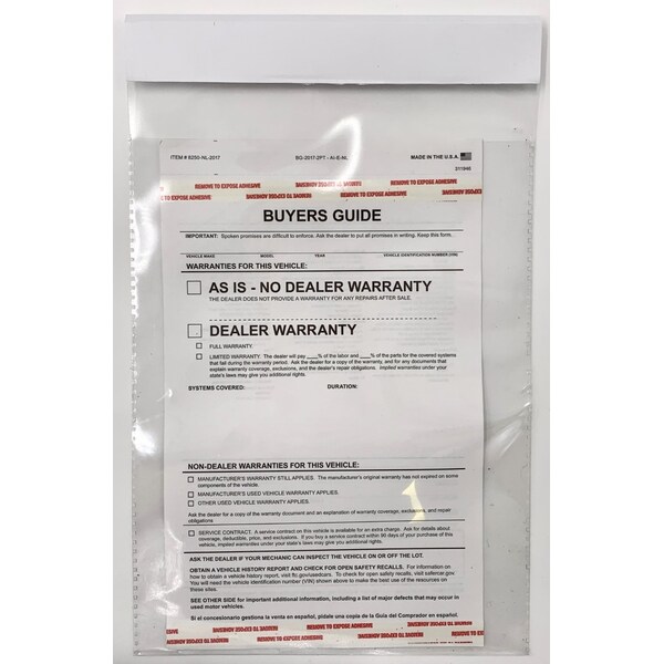 The easiest window form holder on the market! Clear plastic bag clips to window. No more parts or messy adhesive. Top load plastic bag is cut lower on one side so form slides in effortlessly. Form loads from side opposite window for easy removal after sale or during demo drive. Clear plastic bag is 9" x 13" tall. 50/pk.