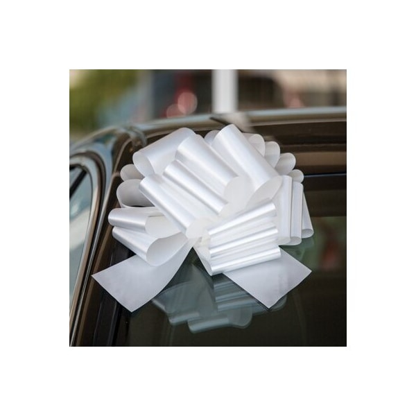 Bring the holidays to your windshields. Ships flat, just pull the string and create your bow in a flash! Conveniently ties to a suction cup for use on a vehicle windshield or use them to decorate the showroom, office cubicles or any large gift worthy of a beautiful bow! This bow has a 12 inch diameter with 8 inch long tails. Made from 4 inch wide shiny weather resistant material, these bows can be used indoors or outdoors. The size of this bow allows them to be used on the windshield to highlight a price, year or vehicle feature. Or use on anything that needs a big shiny bow!