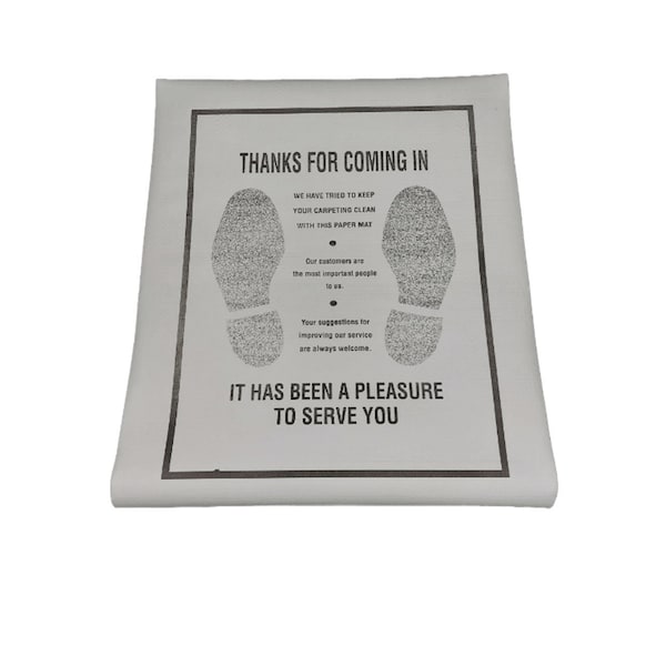 These economical Paper Floor Mats are a great way to protect your customers vehicle while you perform service. Probably the most important auto interior protection product you can use to avoid unnecessary work and poor customer satisfaction.Each mat is approximately 16 in. x 21 in. with "Thanks For Coming In", shoe logos, and additional customer service verbiage printed on each floor mat. Treated water resistant 50# paper with poly backing in each paper floor mat. Quantity 500 per box.