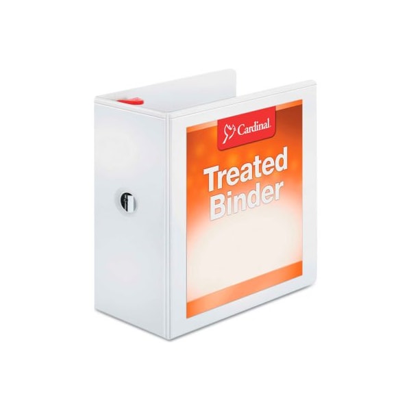 Cardinal treated clearvue locking slant-d ring binder, 5" capacity, white treated binders contain antimicrobial properties built in to protect the product. Locking slant-d rings keep papers secure and hold up to 25% more material than standard round rings. Pvc-free, poly material will not stick to cover inserts or materials inside. Clear overlays on front, back and spine for quick and easy customization. Comfortable geltab triggers. Horizontal pockets on inside front and back covers. this product arrives to most customers in 2-3 business days.
