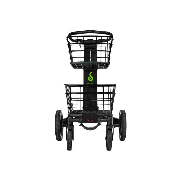 Scout cart scv1c all-purpose folding cart the scout cart will never leave you stranded. This premium folding cart is ideal for transporting supplies to and from home, office, school, stores and professional buildings. The telescoping aluminum frame folds compactly after quick-release baskets are removed. Cargo tray included for moving boxes, crates and bins. The comfort-grip handle adjusts from 36in to 42in so you can stand tall while walking. Ergonomic -- rear wheel positions allow a natural walking gait. One year warranty.