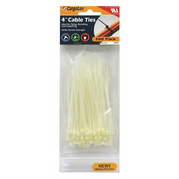 Cable Tie, 4 in L, Natural, Nylon, 18 lb Strength