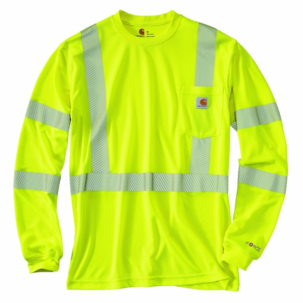 3M Scotchlite Reflective Material, Exclusive Trimming, Turn garment inside out, Machine wash cold separately, Do not bleach, Tumble dry low, Do not use fabric softeners, Cool iron, Do not iron ornamentation, Do not dry clean, Do not industrial launder, Maximum 75 wash cycles, ANSI/ISEA 107-2020, Class 3, Type R, WARNING: This garment is designed to enhance daytime and nighttime visibility when worn properly under normal conditions. Always use extreme caution when working in all traffic conditions. The fluorescent fabrics and retro-reflective fabrics used in this garment will degrade when exposed to ultra violet radiation natural sunlight and will lose their effectiveness overtime. Periodic comparison to a new garment is recommended to ensure the effectiveness of the product. We recommend that this garment be stored in a dark place. Do not use this garment where there is danger of clothing ignition from intense heat, spark or electrical current which could cause a burn injury.Do not remove this label. High-Visibility Long-Sleeve Class 3 T-Shirt 4.25-ounce, 100% polyester bird's-eye knit Meets ANSI / ISEA 107 standard Meets ANSI Class 3, Type R visibility standard; 3M Scotchlite reflective material; Segmented trim #5510 maintains performance through 75 home launderings Built with Force technology to wick sweat and dry fast FastDry technology keeps you cool for all day comfort Stain Breaker technology releases stains Left-chest pocket with sewn-on Carhartt patch Tagless neck label Imported This men's Carhartt t-shirt is designed for jobs where staying visible is important. It's made of 3M Scotchlite reflective material with reflective trim and is ANSI Class 3, Level 2 compliant.