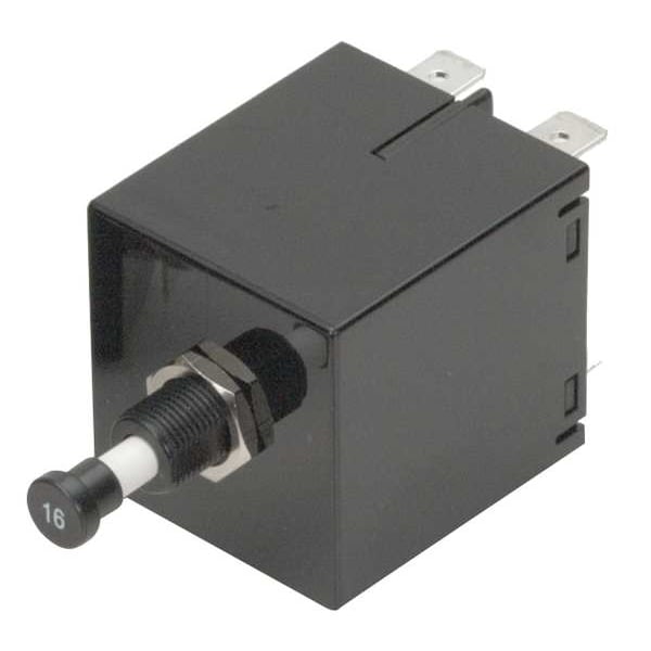Panel Mount Circuit Breaker, Amps 10 A, AC Voltage Rating 250V AC, Terminal Connection 1/4 in Tab, DC Voltage Rating 80V DC, Magnetic, Number of Poles 2, Circuit Breaker Actuator Push Button, Max. AIR Rating Not Rated, Curve Type Medium, Phase Single, Mounting Type Snap-In, Actuator Color White, Panel Cutout Size 1.139 in x 1.420 in, Max. Panel Thickness 0.1 in, Max. Wire Size Not Specified, Length 1.38 in, Width 1.3 in, Depth 1.85 in, Min. Operating Temp. -40 Degrees F
