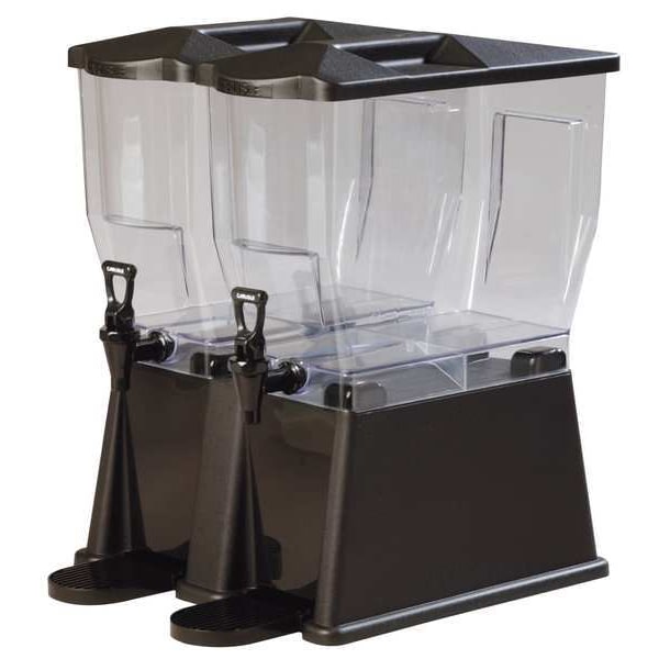Beverage Dispenser, Capacity 7 gal, Shape Rectangle, Color Black, Overall Height 21 1/2 in, Overall Width 15 3/4 in, Overall Depth 16 1/2 in, Number of Dispensers 2, Material Polycarbonate, Dispenser Actuation Faucet, Includes Drip Tray, Fruit Punch Label, Handle, Ice Tea Label, Lemonade Label, Lid, Sweetened Tea Label, Unsweetened Tea Label, Includes Label Yes, Includes Spill Reservoir Yes, Maximum Cup Height 7 1/4 in, Standards NSF, Weight 11.5 lb