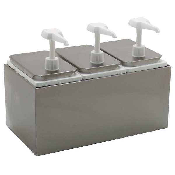 Condiment Pump, Overall Height 12 1/2 in, Overall Width 7 3/4 in, Color Silver, Product Type Condiment Topping Rail, Material Stainless Steel, Overall Depth 14 1/2 in, Number of Compartments 3, NSF Certified No, Top Diameter Not Applicable, Capacity 3 qt