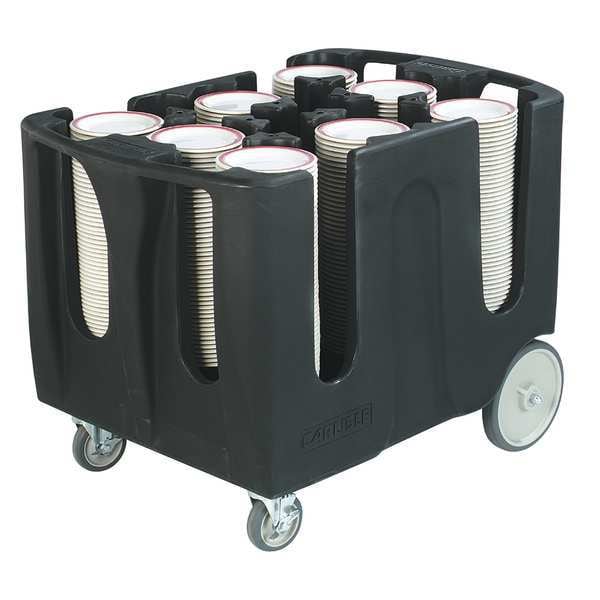 Dish Dolly, Compatible Plate Diameter 9 3/4 in, Handle Included Yes, Compatible Rack Brand Carlisle, Overall Length 43 in, Overall Width 28 in, Color Black, Drain Holes Included No, Material Polyethylene, Number of Casters 4, Overall Height 31 3/4 in, Product Type Dish Dolly, Caster Type (2) Rigid, (2) Swivel, Number of Compartments 6, NSF Certified Yes