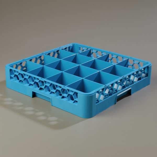 Glass Rack, Material Polypropylene, Compartment Size 3 1/2 x 4 7/16 in, Maximum Cup Height 3 in, Maximum Cup Diameter 4 1/4 in, Maximum Handling Temperature 180 Degrees F, Inside Rack Height 3 1/4 in, Product Type Glass Rack, Color Blue, Number of Compartments 16, Outside Rack Height 4 in, Overall Depth 3 1/4 in, Overall Height 4 in, Overall Length 19 7/8 in, Overall Width 19 7/8 in, NSF Certified Yes, Package Quantity 6