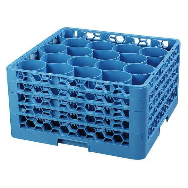 Glass Rack with 3 Extenders, Material Polypropylene, Compartment Size 3 13/16 x 9 1/2 in, Maximum Cup Height 9 3/8 in, Maximum Cup Diameter 3 1/2 in, Maximum Handling Temperature 180 Degrees F, Product Type Glass Rack, Color Blue, Number of Compartments 20, Outside Rack Height 10 1/4 in, Overall Depth 9 1/2 in, Overall Height 10 1/2 in, Overall Length 19 7/8 in, Overall Width 19 7/8 in, NSF Certified Yes, Package Quantity 2
