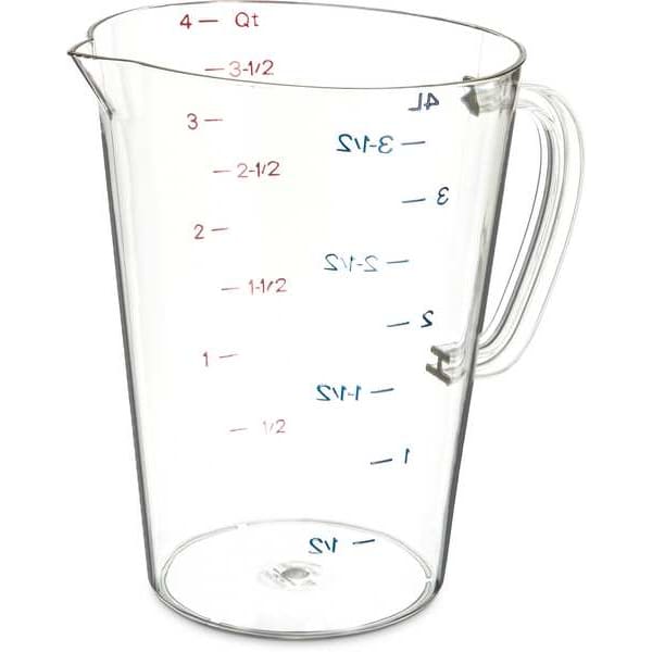 Measure Cup, Overall Height 9 1/16 in, Material Polycarbonate, Color Clear, Handle Color Clear, Maximum Temperature Resistance 212 Degrees F, Capacity 1 gal, Dry/Liquid Dry, Liquid, Product Type Measuring Cup, Graduation Subdivisions 4 quarts, Overall Length 8 3/8 in, Overall Width 8 11/16 in, NSF Certified Yes