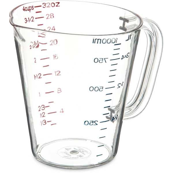 Measure Cup, Overall Height 5 5/16 in, Material Polycarbonate, Color Clear, Handle Color Clear, Maximum Temperature Resistance 212 Degrees F, Capacity 1 qt, Dry/Liquid Dry, Liquid, Product Type Measuring Cup, Graduation Subdivisions 1 qt, Overall Length 5 3/4 in, Overall Width 6 5/16 in, NSF Certified Yes