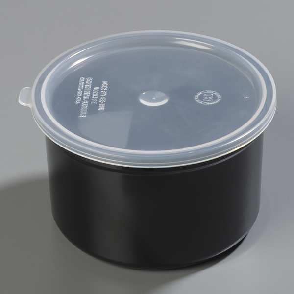 Food Crock with Lid, Includes Snap-On Lid, Product Type Food Crock with Lid, Capacity 1.5 qt, Dishwasher Safe Yes, Freezer Safe No, Inside Diameter 6 1/2 in, Material Plastic, NSF Certified Yes, Oven Safe No, Overall Height 4 in, Color Black, Package Quantity 6