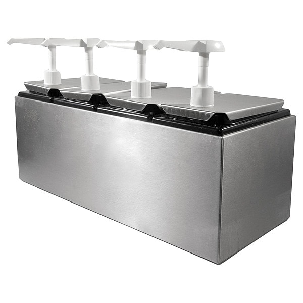 Topping Rail with Pumps/Jars, Overall Height 12 1/2 in, Overall Width 7 3/4 in, Color Silver, Includes (4) Standard Pumps, Jars, Product Type Topping Rail, Material 18-8 Stainless, Overall Depth 19 1/4 in, Number of Compartments 4, NSF Certified No, Capacity 1.25 fl oz