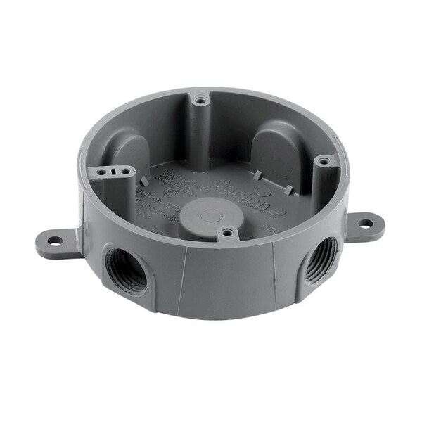 Carlon E365DR is a single gang round weatherproof T-box with five 1/2 inch threaded holes. The T-Box can be used with non-metallic wiring systems. Made of durable PVC. The round T box is suitable for wet or damp locations. The box will not rust or corrode making it an ideal choice for outdoor, weatherproof applications.