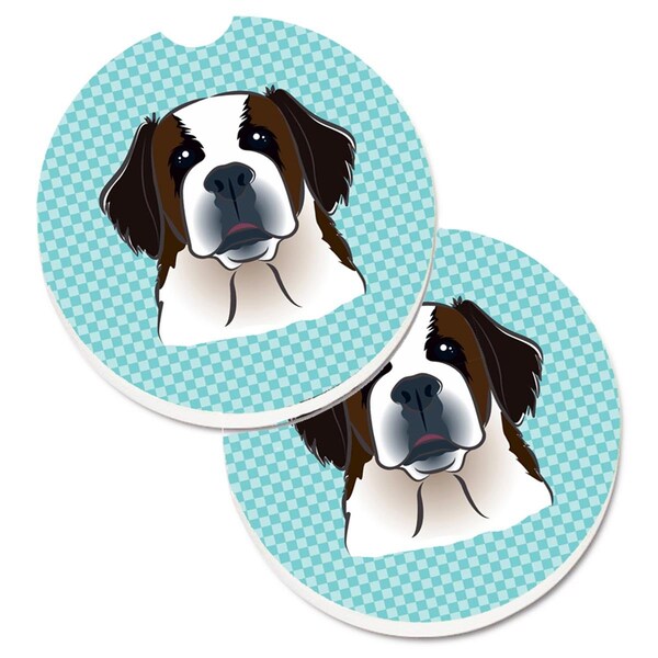 Checkerboard Blue Saint Bernard Set of 2 Cup Holder Car Coaster