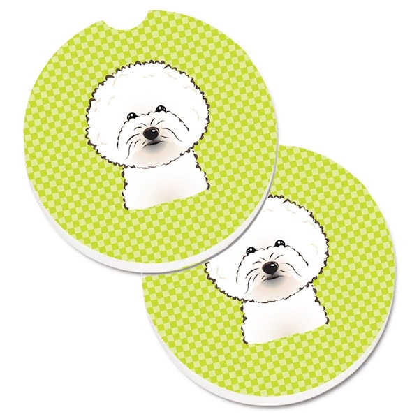 Checkerboard Lime Green Bichon Frise Cup Holder Car Coaster, PK2