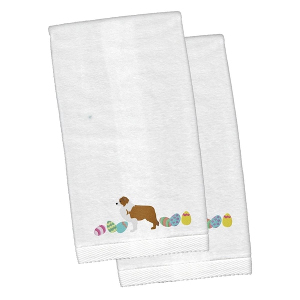 Red Border Collie Easter White Embroidered Plush Hand Towel, 2PK
