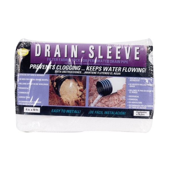 Protect perforated drain pipes from sand and sediment clogging with this drain-sleeve 4 inch x 10 feet filter sock. Designed for pipes 3 - 4 inch in diameter, this fabric filter sock creates a water-permeable barrier to keep deposits from building up in drain pipes and reduces the need for gravel backfill. This seamless filter sock slips over pipes quickly and easily and it resists tearing.