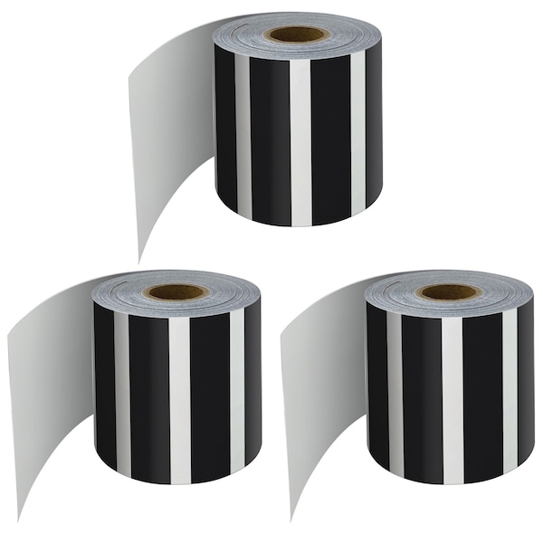 Carson Dellosa's Black and White Striped Bulletin Board Border brings added style to your classroom, dorm room, party, daycare, or homeschool setting. This set includes one roll of straight, classic, black and white striped bulletin board border trim printed on thick but flexible paper that can be used for solo displays or multiple learning visuals. Decorate your learning space with a single layer border, or add layers to create dimension to your displays. The border is great for adding an eye-catching design and pop of color to any standard visual or decorative display. For a cohesive theme, check out coordinating Carson Dellosa teaching supplies and classroom decorations. Education happens everywhere, and Carson Dellosa strives to provide the tools needed to inspire learning everywhere it happens. Each rolled border measures 2-1/4 inches by 65 feet to decorate bulletin boards, desks, classroom walls, lockers, and more with ease. Sold as a pack of 3 rolls.