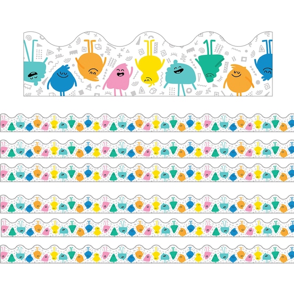 Decorate any room or display with the cheerful vibes of the Happy Place Happy Friends Scalloped Border! This border set features colorful, cheerful, and happy people to add a fun and welcoming finishing touch to any kind of curriculum bulletin board.Decorate your space with cheerful vibes with Carson Dellosa's Happy Place Happy Friends Scalloped Borders! The unique bulletin border features colorful, cheerful, and happy people to add a touch of positivity and inclusivity to your learning displays, wall decor, classroom borders, and more. Cut and layer your border to add dimension to any display. Each pack includes 13 durable strips of bulletin board borders made from flexible yet thick paper, each measuring 3 feet by 2-1/4 inches for a total length of 39 feet-perfect for bulletin board decor, lockers, door displays, and more! Sold as 6 packs for a total of 78 strips 234 feet.Check out the Happy Place collection to create a cohesive classroom theme. Education happens everywhere, and Carson Dellosa strives to provide the tools needed to inspire learning everywhere it happens.